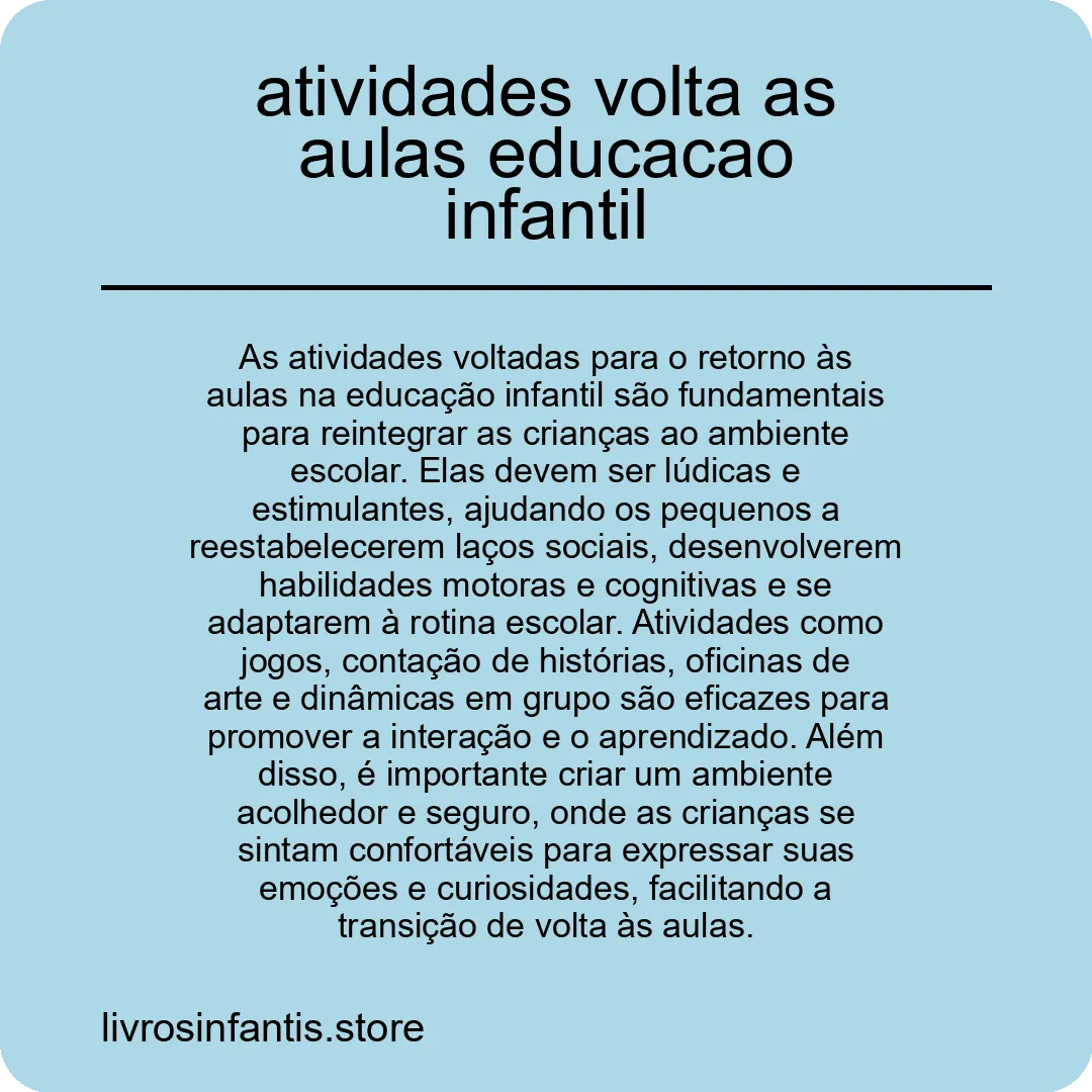 As atividades voltadas para o retorno às aulas na educação infantil são fundamentais para reintegrar as crianças ao ambiente escolar. Elas devem ser lúdicas e estimulantes, ajudando os pequenos a reestabelecerem laços sociais, desenvolverem habilidades motoras e cognitivas e se adaptarem à rotina escolar. Atividades como jogos, contação de histórias, oficinas de arte e dinâmicas em grupo são eficazes para promover a interação e o aprendizado. Além disso, é importante criar um ambiente acolhedor e seguro, onde as crianças se sintam confortáveis para expressar suas emoções e curiosidades, facilitando a transição de volta às aulas.
