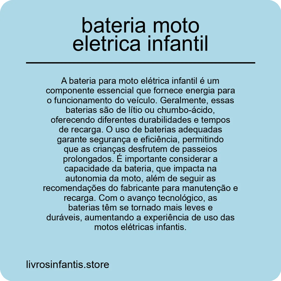 Uma bateria para moto elétrica infantil é uma fonte de energia recarregável que alimenta o motor da moto elétrica, permitindo que a criança a utilize para brincar.