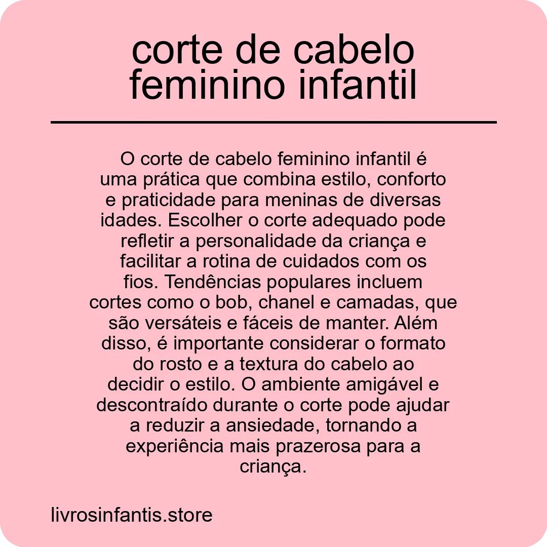 O corte de cabelo feminino infantil é uma prática que combina estilo, conforto e praticidade para meninas de diversas idades. Escolher o corte adequado pode refletir a personalidade da criança e facilitar a rotina de cuidados com os fios. Tendências populares incluem cortes como o bob, chanel e camadas, que são versáteis e fáceis de manter. Além disso, é importante considerar o formato do rosto e a textura do cabelo ao decidir o estilo. O ambiente amigável e descontraído durante o corte pode ajudar a reduzir a ansiedade, tornando a experiência mais prazerosa para a criança.