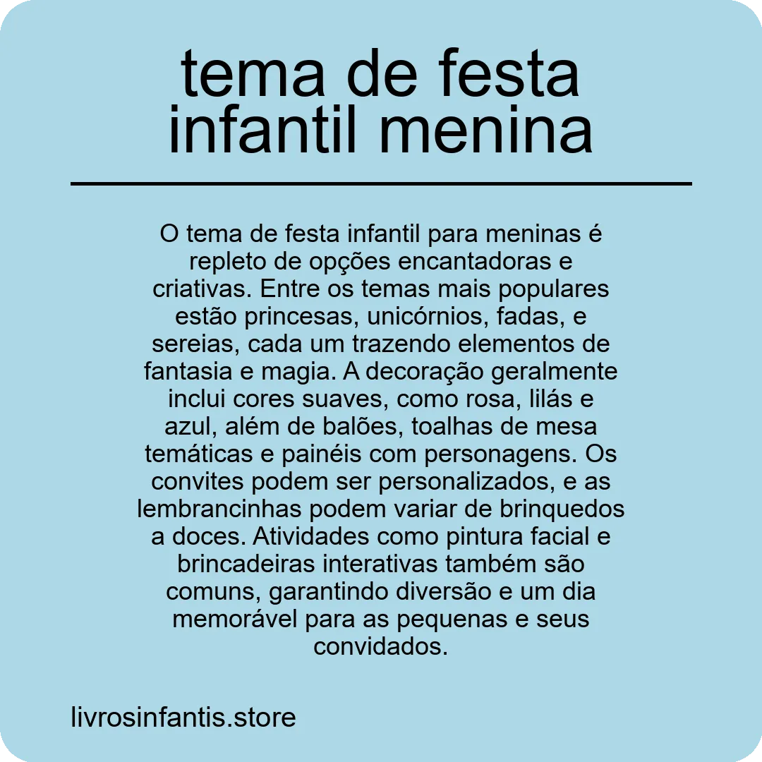 A escolha do tema pode ser influenciada por diversos fatores, como os interesses da criança, tendências atuais e até mesmo a estação do ano. Aqui estão alguns temas populares que podem agradar a maioria das meninas: