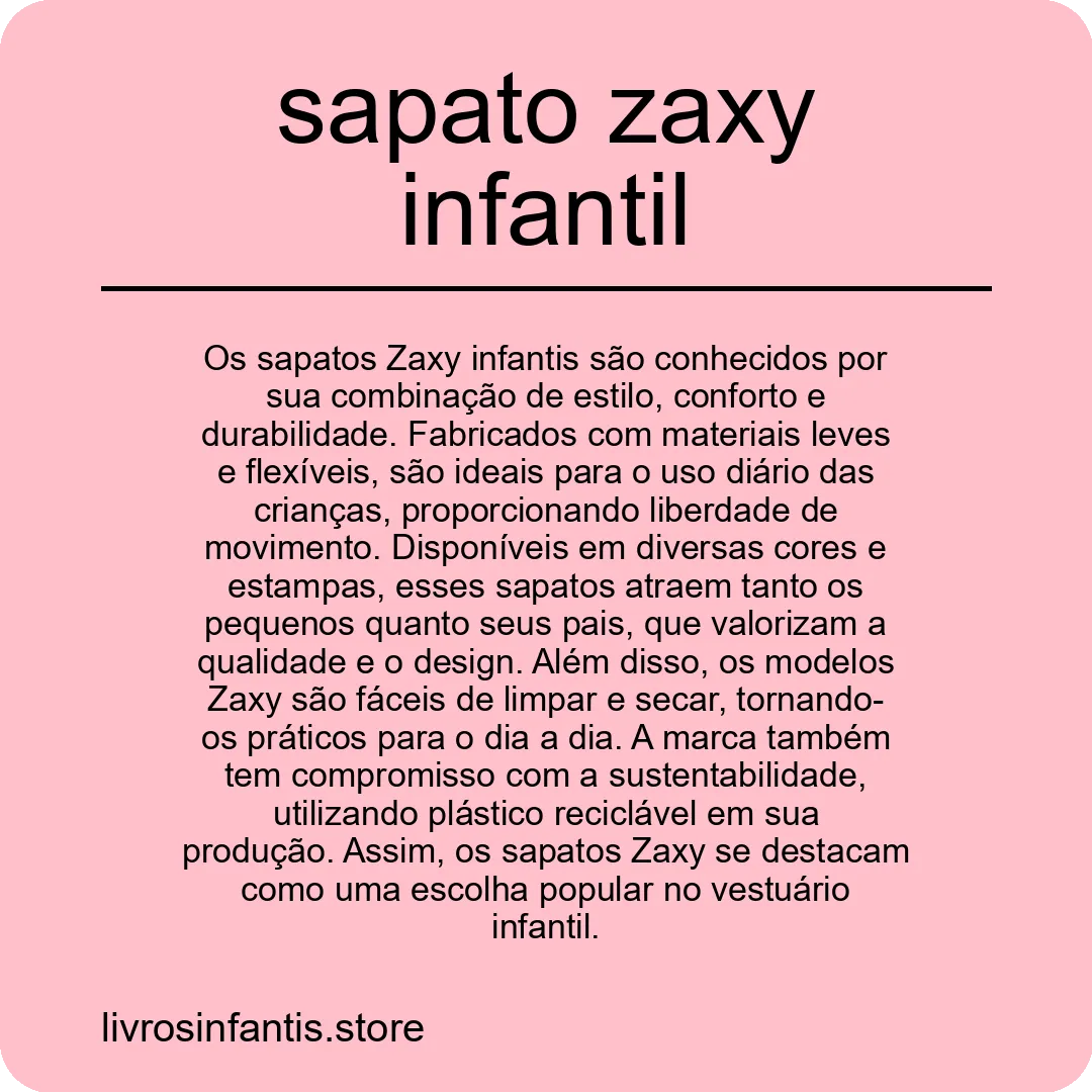 Os sapatos Zaxy infantis são conhecidos por sua combinação de estilo, conforto e durabilidade. Fabricados com materiais leves e flexíveis, são ideais para o uso diário das crianças, proporcionando liberdade de movimento. Disponíveis em diversas cores e estampas, esses sapatos atraem tanto os pequenos quanto seus pais, que valorizam a qualidade e o design. Além disso, os modelos Zaxy são fáceis de limpar e secar, tornando-os práticos para o dia a dia. A marca também tem compromisso com a sustentabilidade, utilizando plástico reciclável em sua produção. Assim, os sapatos Zaxy se destacam como uma escolha popular no vestuário infantil.